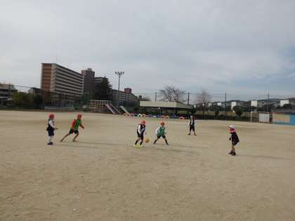 攻め方や守り方を相談しながら,みんなで楽しく試合をしています。