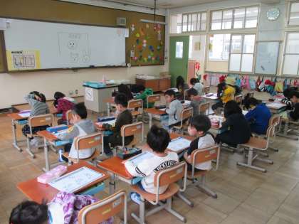 入学二日目。小学校生活のリズムに少し慣れた1年生。チャイムの合図で動くことを意識してがんばっています。今日は1組も2組も,えんぴつの持ち方の勉強や手を挙げて発表する勉強をしました。みんなはりきって,小学校の勉強をがんばりましたよ。すごいね。