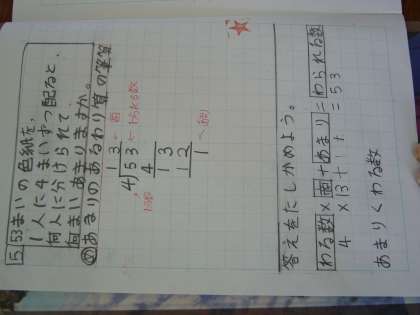 4年生になって,初めて学習します。わり算のひっさん。立てて・かけて・ひいて・おろして・・・の繰り返しですが,なかなかむずかしいですね。集中してがんばっています。