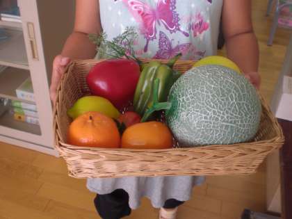 写真にあるような果物や野菜の模型を使ったり,シールを使ったりして子どもたちに合わせた学習の仕方で進めています。