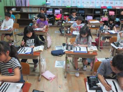 子どもたちは,「筆で書くのって難しい。」「うまく書けた!」など様々な話をしていました。