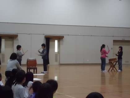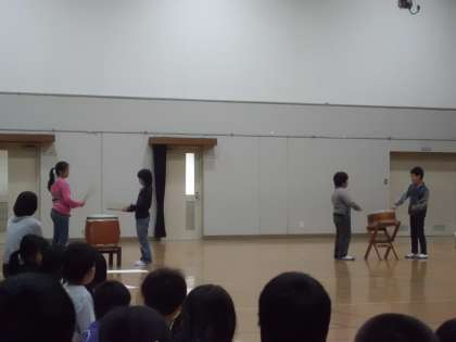1年生を迎える会で和太鼓の演奏を披露していました。