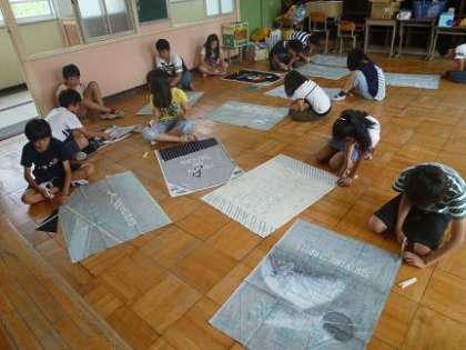 エプロン作りに入りました。自分の気に入った柄の布を裁ちばさみで切っています。きれいに拭いた床の上に布を広げてハサミを浮かさないように切りました。