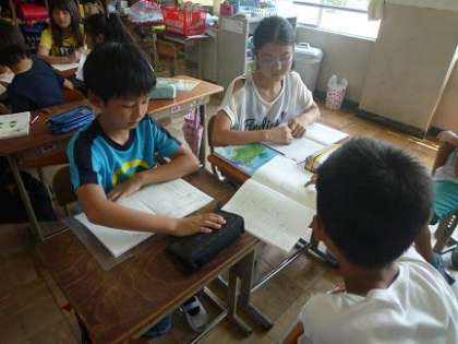 新しい単元の学習に入りました。1時間目は5年生での学習を思いだし,分数×整数の問題を解きました。2時間目の今日は,かける数もかけられる数も分数です。計算は分かるけど,なぜその答えになるのか,どう考えたのか,友だちに説明するにはどう言えばいいか・・・・線分図や図を描き友だちと話し合いました。自分の考えを声に出し,伝えることを今後の学習でも頑張っていきたいです。