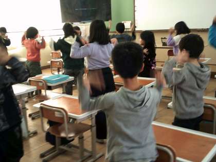 今日の英語活動では英語で「あたま・かた・ひざ・ぽん」を歌いました。どんどん速くなっていく音楽に合わせてダンスも踊りました。「速い〜」と言いながらも遅れないように楽しそうに踊っていました。