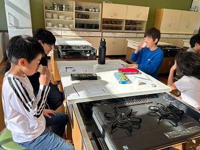 だしの先生が来てくださり、いろいろな種類のだしを味わうことができました。昆布だし、かつおと昆布の合わせだし、吸い地を飲ませていただき、かつおと昆布の相性や合わせることでうまみが深まることに気づくことができました。だしのうまみのひみつに迫ることができました。