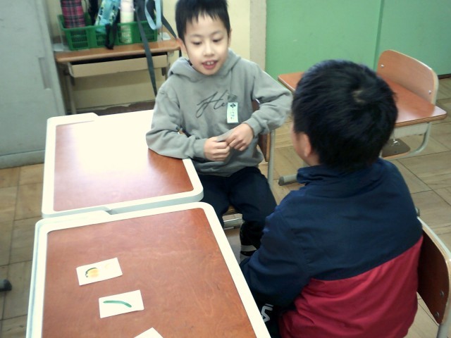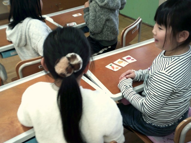 2年生の英語活動ではペアになって野菜をあげたりもらったりする練習をしました。何ていうのと困っている子にはやさしく教える姿が見られました。
