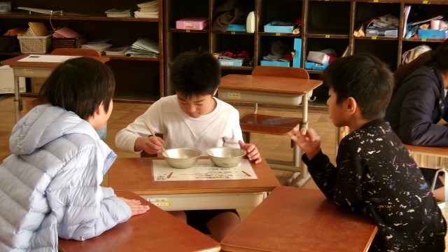 お箸の持ち方に注意して、豆つまみをしました。休み時間に練習をしていますが、今日は学年での予選を行いました。4年生ではみんなが静かに見守る中、同点決勝が行われました。
