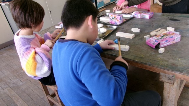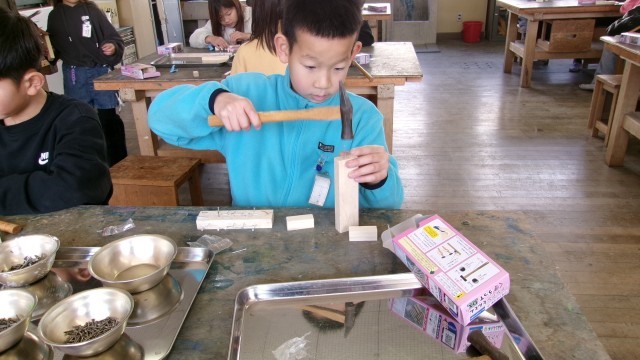 図工では、金槌の使い方を学習しました。持ち方や、運び方、力の入れ方などを学習し、作品作りに入っています。釘を模様のようにまっすぐにだけでなく、斜めに打ったり、つぶしてみたり・・・面白い打ち方を工夫しています。安全に気をつけて楽しくトントンしています。
