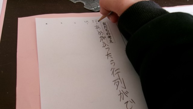 まわるというルールで行いました。友だちがどんな考えなのかを短く書くことで、だれがどんなことを言っているのかをしっかり理解して聴くことができました。