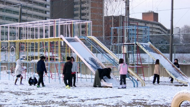 この辺りでは滅多にない積雪の朝に、子どもたちは大興奮です。