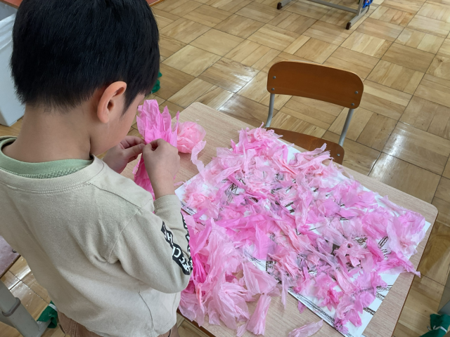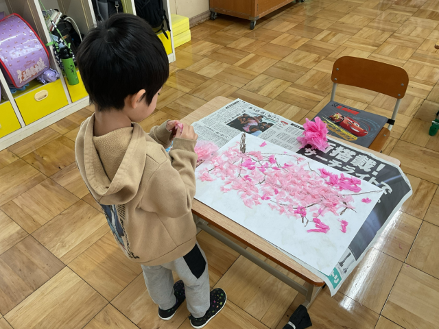 今日の図画工作の学習では木の幹を描き、その上に花びらを散らしました。4月に咲く綺麗な桜の様子を想像しながら作品を完成させることができました。