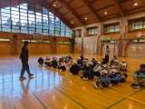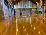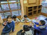 プレイホールでの最初の活動は班対抗のリレーです。新聞紙を使ったり、鹿になりきった...