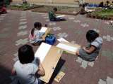図工の時間。 花壇にきれいに咲いたチューリップの絵を描きました。花壇の横には...