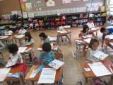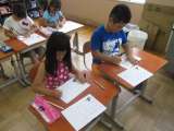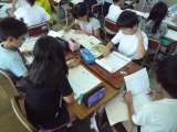 ノートを開いて,下敷きを敷いて,丁寧に書いています。 お兄さんやお姉さんと同じよ...