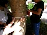昨日に引き続き、巻き尺を使って長さを測りました。今日はグループで協力して「木の幹...