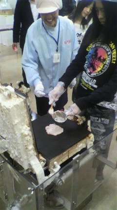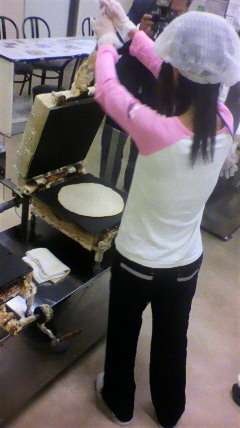えびせんべいの里に到着して,9時からえびせんべいの手作り体験をしています。おいしいえびせんべいが焼けるかな?