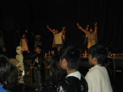 4年生は,ミュージカル「池田東パーク〜おばけやしき物語〜」をしました。お化けに扮している従業員だけでなく,本当のお化け達も,さびれたお化け屋敷を立て直すためにアイデアを出し合いました。そして,リニューアルオープンにこぎつけ,踊ったり演奏したりします。