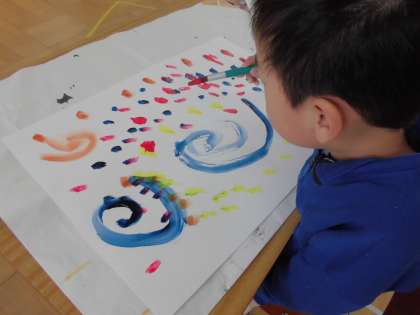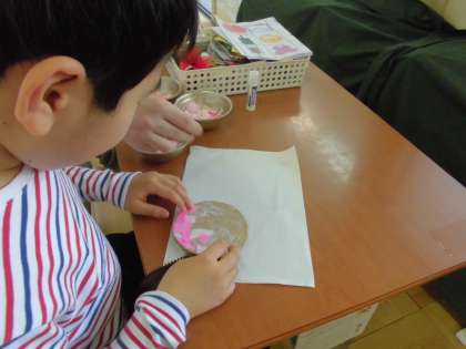 図工の時間に,「色・形・いいかんじ」の授業をしました。色の濃淡を楽しみながら絵の具を使って絵を描くことができました。また,今年度入った1年生のために,桜色のメダルを作りました。子どもたちはメダルを渡すのを楽しみにしています。