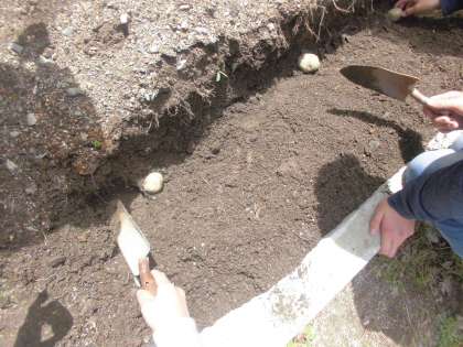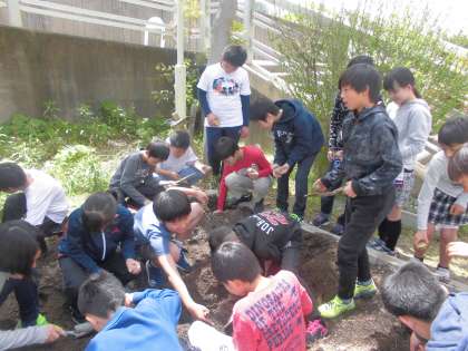 6年生は,「植物の成長と日光の関わり」の学習で,じゃがいもを観察に使います。今日は,その観察で使うじゃがいもの種芋を学年の畑に植えました。