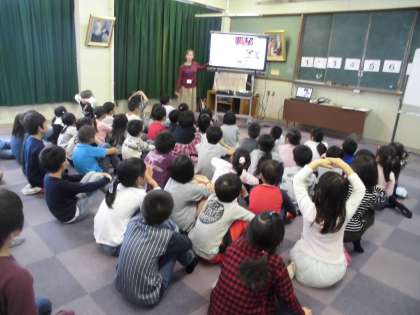 ALTのクープライダー・キンバリー先生と一緒に,先生の自己紹介を聞いたり,歌を歌ったりして楽しく学習しました。
