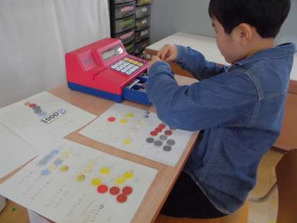 算数でお金を操作する活動や,国語でひらがなの積み木を使った言葉作りの活動をしました。