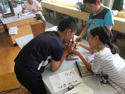 接眼レンズや対物レンズ,調節ねじ,反射鏡など,それぞれの部分の名前と,その使い方を実際に使いながら学習しました。