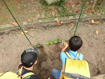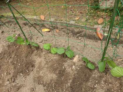 ツルレイシが大きくなり,いくつかまきひげが出ていたので,まきひげが出ていた分を畑に植えかえました。
