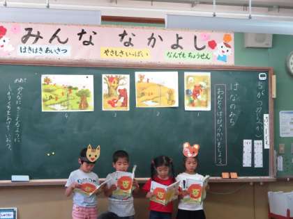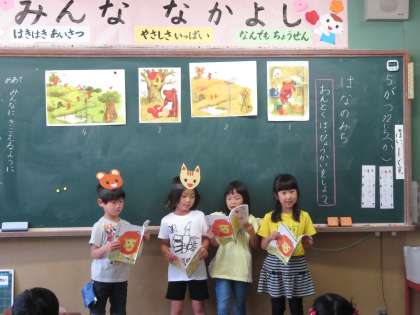 国語の学習では,「はなのみち」の音読発表会をしました。グループごとに練習をして,みんなの前で役になって言うことができました。