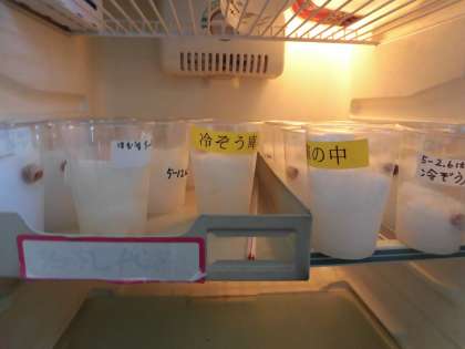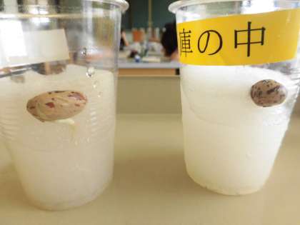 1つは教室で暗所保管(冷蔵庫の暗所に条件を合わせるために暗所で実験しました。)し,もう1つは冷蔵庫で保管していたのですが,結果は教室の方は発芽し,冷蔵庫の方は発芽しませんでした。