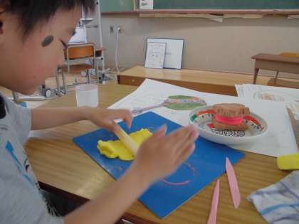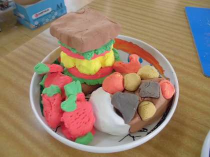 事前に自分たちで考えたメニューをもとに,紙粘土を練って作品をつくりました。