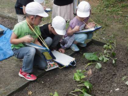 なると金時の葉を観察しました。「葉からおいもの匂いがする!」や「葉がさらさらしている!」と,匂いや触り心地など,五感を働かせて気づいたことをたくさん文章に表していました。収穫の日を楽しみに,毎日水やりも頑張っています。