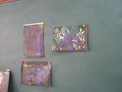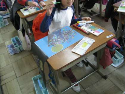 今,3・4年生は図工科で版画をしています。4年生は下絵を考えています。3年生は刷りに入っています。絵の具を使った一版多色刷りをしています。