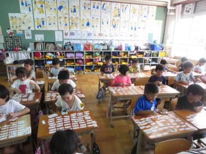 1年生の算数の学習では,たし算がに挑戦しています。今日は計算カードを使って,10になる式を見つけたり,となりの席の友達とカードを使ったゲームをしたりしました。「答えはいくつ?」「○○!」というやり取りを楽しみながら,計算をしていました。カードを使って何度も練習して,スラスラ言えるように頑張っていきたいですね。