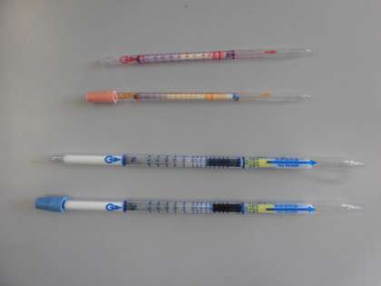 ホウセンカに袋をかぶせ,そこに息を吹き込んで,吹き込んだ直後と約2時間外においた後の酸素の量と二酸化炭素の量を,気体検知管を使って調べました。