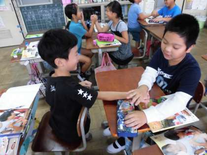 今日は,「わたしたちの体と運動」の学習を始めるにあたって,ものを持ち上げたり,体を支えたり,うでずもうをしながら,そのときの,うでのようすを確かめました。