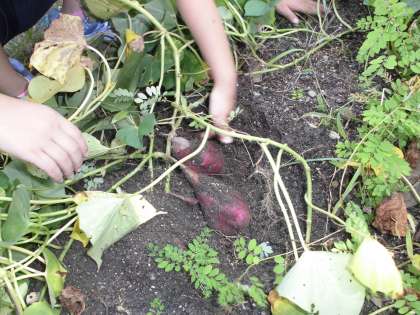 サツマイモの収穫をしました。長くなったつる(2〜3メートル)をどけて,おイモに傷がつかないように,ていねいにおイモの外側の土を掘っていきました。つるを引くと、3つ4つのおイモがつるとともに並んで出てきた人もいて大喜びでした。しばらく学校において甘くなるのを待ちたいと思います。来週は徳島のJAのみなさんもお越しになっての収穫祭を行います。当日は,本場のなると金時をお持ちいただいて,焼き芋やアメリカンスイートポテトを作っていただきます。楽しみですね。お家の皆さんもご来校をお待ちしています。