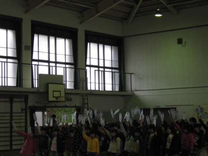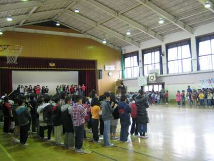 はじめのことばの後は,校長先生の指揮で「よろこびの歌」全校合奏をしました。その次は,3年生の出し物でした。