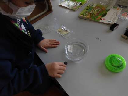 また,水槽にクリップを浮かべ,外から磁石を近づけると,水槽の中のクリップが動き,水槽みたいな磁石につかないものが間に入っても,磁石は鉄を引きつけることがわかりました。