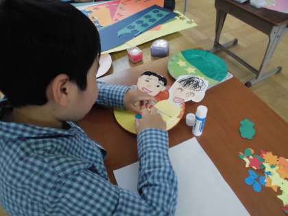 今日の図画工作の学習では,教室の後ろに1年の見通しがもてるように観覧車の壁面を作りました。紙皿に色をつけたり,画用紙で型をぬいたのを貼ったりと一生懸命に作品作りに取り組むことができました。