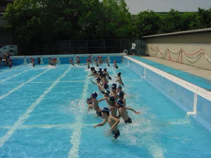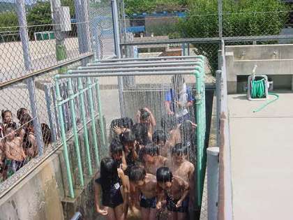 体育学習で1,2年生が,シャワーを浴びたり波を作ったりして,水泳学習を始めました。とても良いお天気で暑いぐらいだったので,楽しく水慣れができました。