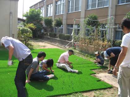 おやじの会を中心に今年度は中庭を改修します。人工芝を敷いて「いこいの場所」を作る計画です。第1回目の今日は,人工芝のジョイントをつなぎ敷き詰めて,金槌を使ってピンでトントンと留めていきました。手作りの芝生ランドです。お休みの日にご協力ありがとうございました。来週は,これに砂を入れて芝生を落ち着かせます。