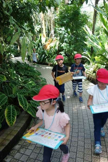 植物園に着いたら,さっそく温室の中を探検します。どんな色の植物があるか探しながら回りました。