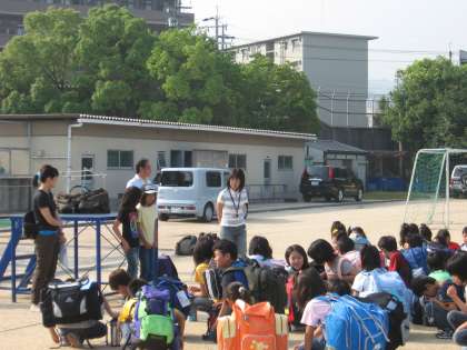 みさきの家の出発式。4年生47名全員元気よくみさきの家に向け出発しました。