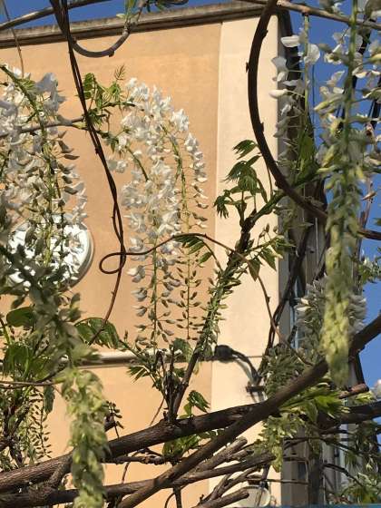 暑くなりましたが,今朝学校の門に桜の花が咲いているのを見つけました。暑い中でもまだ咲いてくれているのだなぁと少し春を懐かしく感じました。下のもう一枚の写真は,以前に紹介した藤です。つぼみが開いて,真っ白な花が咲き始めました。春から夏へ少しずつ季節が変わってゆきます。
