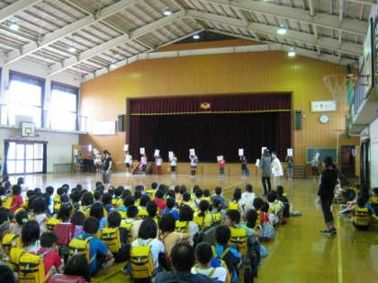 5校時の途中から避難訓練を行いました。大型台風が接近して暴風雨警報が発令されたという設定で,体育館に集合しました。安全主任の先生や校長先生の話の後に,学校待機の児童を確認して町ごとに集まりました。