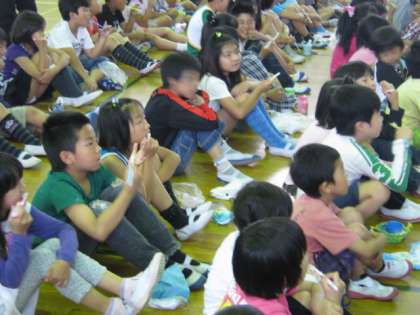 4校時に体育館で2・3年生合同の歯みがき指導がありました。