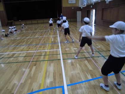 まずは,跳び方の確認。線の上をまたぐように,リズムよく移動するのがとても難しく苦戦している子もたくさんいましたが,何度か繰り返していくうちに,コツをつかみ跳べるようになっていきました!