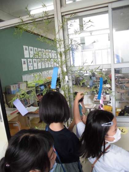 教室の入口に立てかけた笹に,