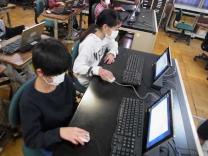 パソコンになれるために,コンピュータ室に行きました。もうすでに家で使ったことのある子,初めて触る子,みんなとても楽しそうに学習していました。今回は基本的な「パソコンを立ち上げる」,「パソコンを閉じる」,「クリック」,「ダブルクリック」という操作を主に練習するため,お絵かきソフトを使って自由に絵や文字を書いてみました!